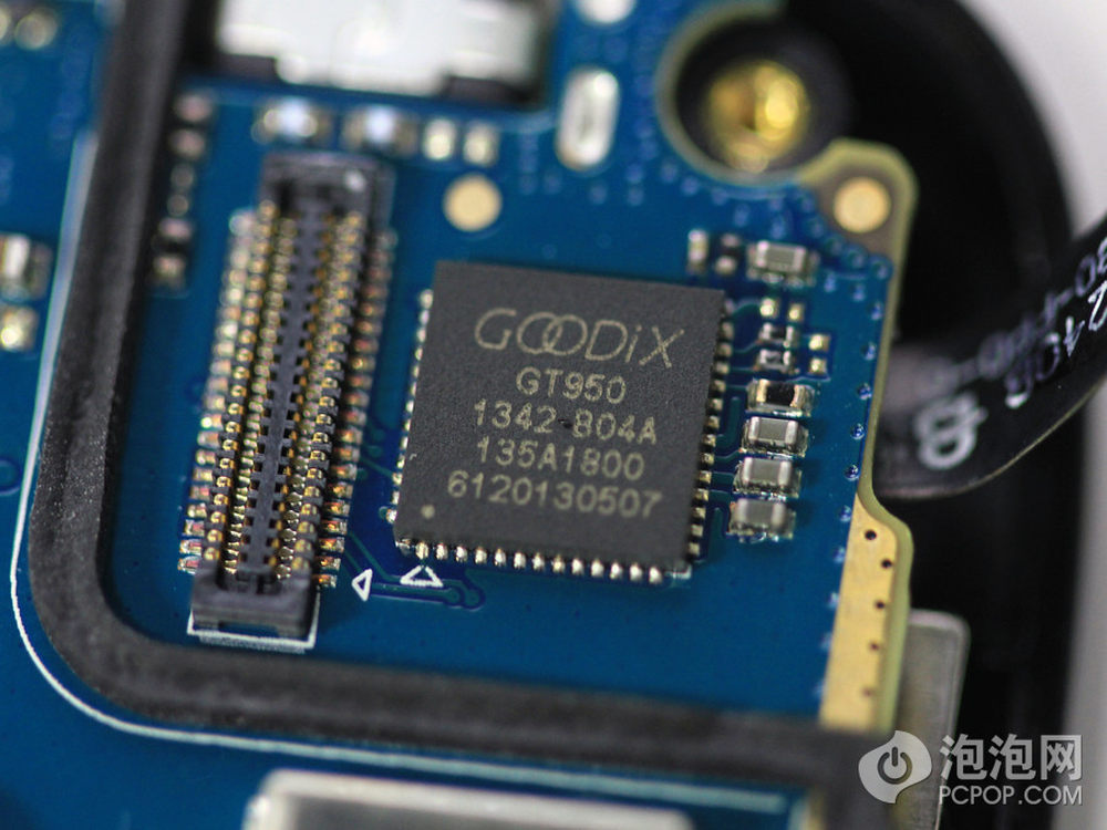 在手机右侧靠上的位置是屏幕的排线,断开排线能够看到GOODiX GT950触控芯片,该芯片的性价比非常不错。