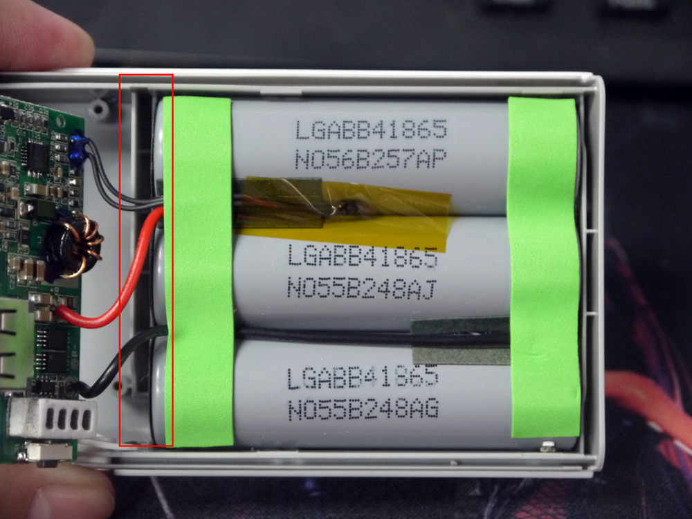 红框处是联想独到的设计“泄压舱”,实际上就是塑料模具多开一点空间,万一电芯膨胀能缓解膨胀压力减少风险。而这部分也是电芯的正极位置,并联用的材料并不是我们常见的镍片,而是铜芯橡胶绝缘线,这种线外侧绝缘,防止和PCB一侧元件接触短路,另一侧把3节18650并联在一起,而且它的延展性比镍片好,可以有效避免外力冲击,在正常使用中可能体现不出来,一旦出现剧烈的磕碰,或者几百公斤的压力时小新脱焊、爆炸、起火的概率要远小于一般的移动电源。总的来说联想通过一系列精细的设计保证小新比其他移动电源更抗蹂躏,更安全。7/7