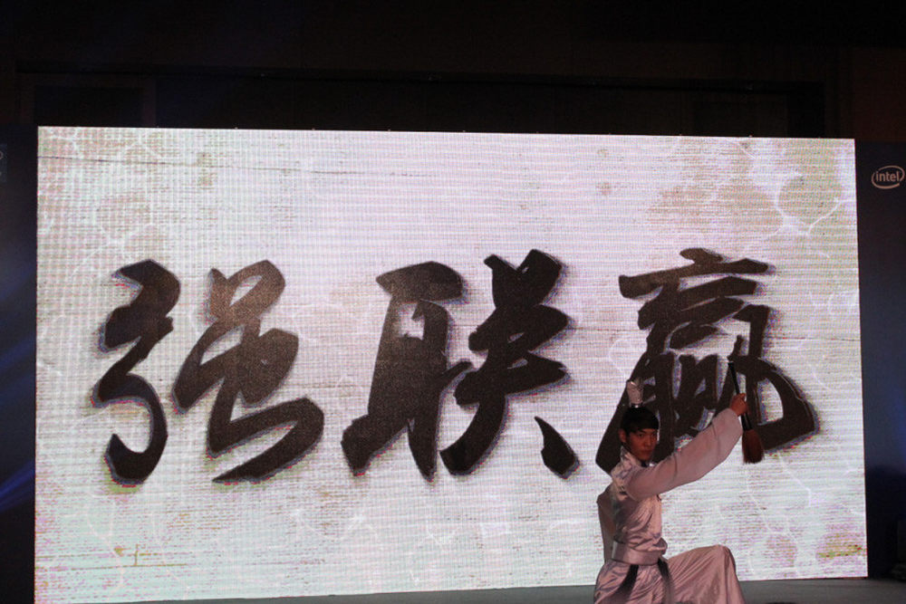 发布会以一段中国风舞蹈开场,演员手执毛笔,在屏幕上“写”下了强 联 赢 三个大字,示着本次技嘉、英特尔、腾讯游戏强强联合,必定在市场取得共赢局面。3/23