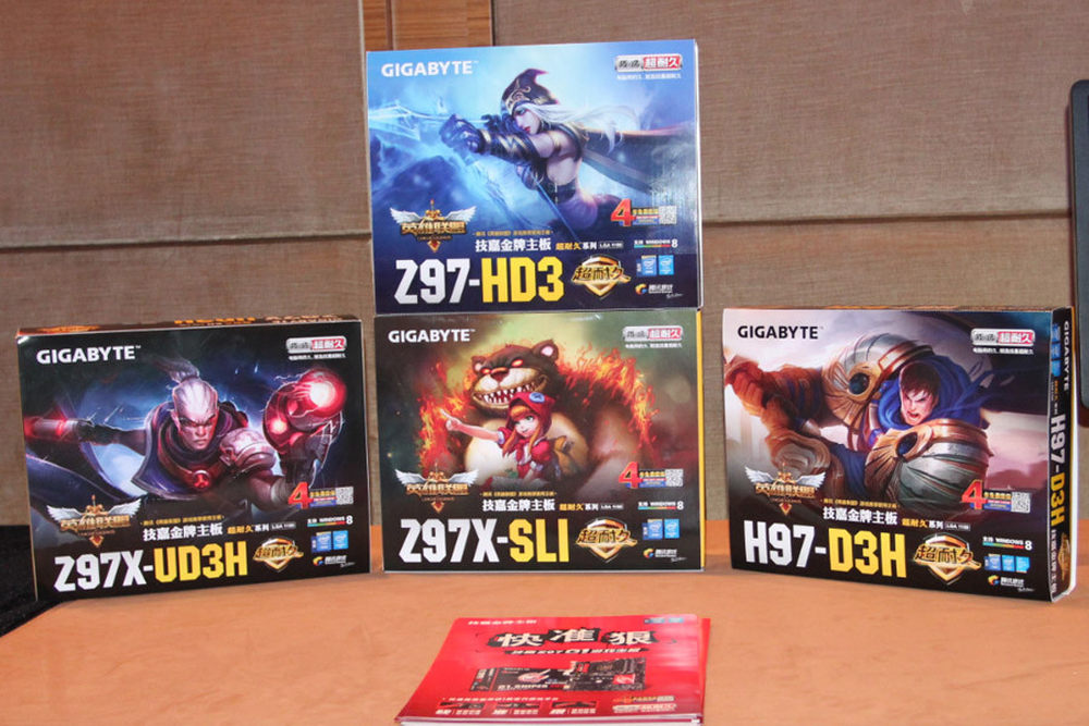 技嘉英雄联盟主题主板产品展示:Z97的多个型号已经采用英雄联盟主题包装盒,并附有赠品。18/23