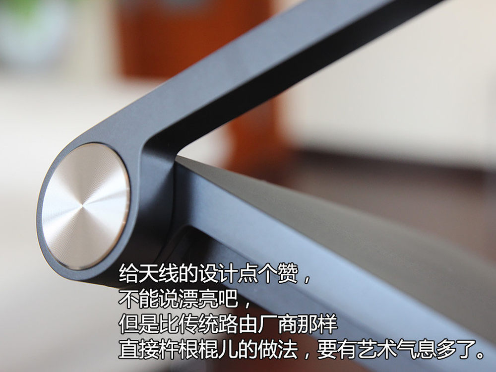 顶端天线转轴处设计的还是很好看的,尤其是两端的金属质感做的很漂亮。大家可以对比一下这个转轴的直径和机身厚度的对比,你会不由的赞叹这款路由在机身厚度上做出的成绩,实在太薄了。7/16