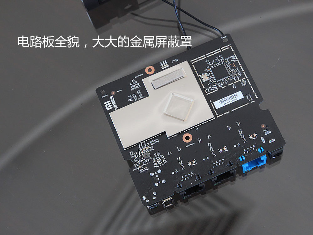 电路板的正面,是一个大大的金属屏蔽罩,罩住了CPU和内存颗粒。而且,还为CPU和负责传输的芯片提供了硅胶散热,很细致,完全是把路由当作一台PC来对待。15/16