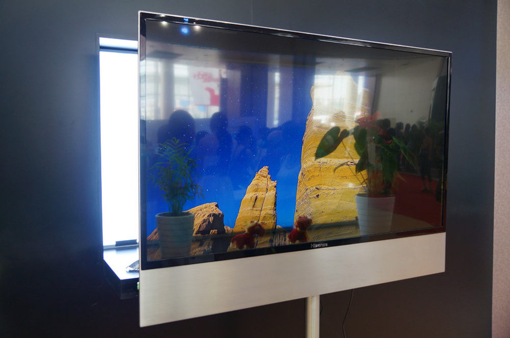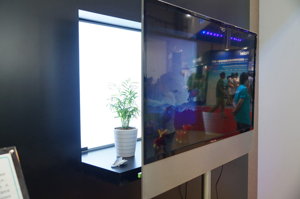透明电视时海信展台人气颇高的展区,看到电视里的盆景和毛绒玩具了吗?9/12