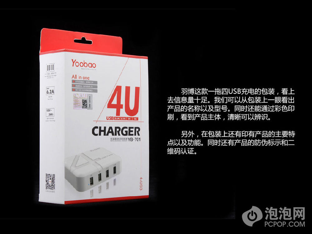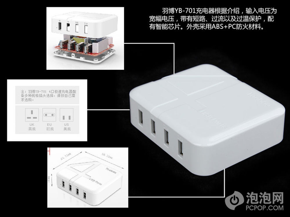 泡泡网移动电源频道8月6日 如今我们周边的移动设备越来越多,需要USB接口充电设备也是越来越多,尤其是当我们准备第二天出游,需要把所有用电设备充满的时候,我们惊讶的发现,排插的插座实在是不够用啊。当然,出差在酒店里充电可能也会遇到这样的情况。不过,最近羽博推出一款非常实用的USB充电产品,型号为YB-701。