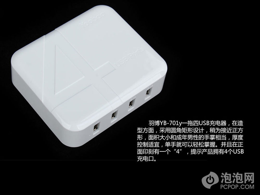 羽博YB-701y一拖四USB充电器,在造型方面,采用圆角矩形设计,稍为接近正方形,面积大小和成年男性的手掌相当,厚度控制适宜,单手就可以轻松掌握。并且在正面印刻有一个“4”,提示产品拥有4个USB充电口。