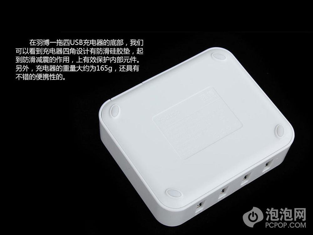 在羽博一拖四USB充电器的底部,我们可以看到充电器四角设计有防滑硅胶垫,起到防滑减震的作用,上有效保护内部元件。另外,充电器的重量大约为165g,还具有不错的便携性的。