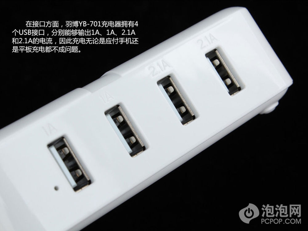 在接口方面,羽博YB-701充电器拥有4个USB接口,分别能够输出1A、1A、2.1A和2.1A的电流,因此充电无论是应付手机还是平板充电都不成问题。