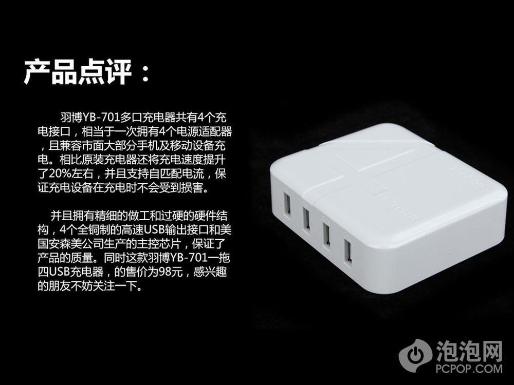并且拥有精细的做工和过硬的硬件结构,4个全铜制的高速USB输出接口和美国安森美公司生产的主控芯片,保证了产品的质量。同时这款羽博YB-701一拖四USB充电器,的售价为98元,感兴趣的朋友不妨关注一下。