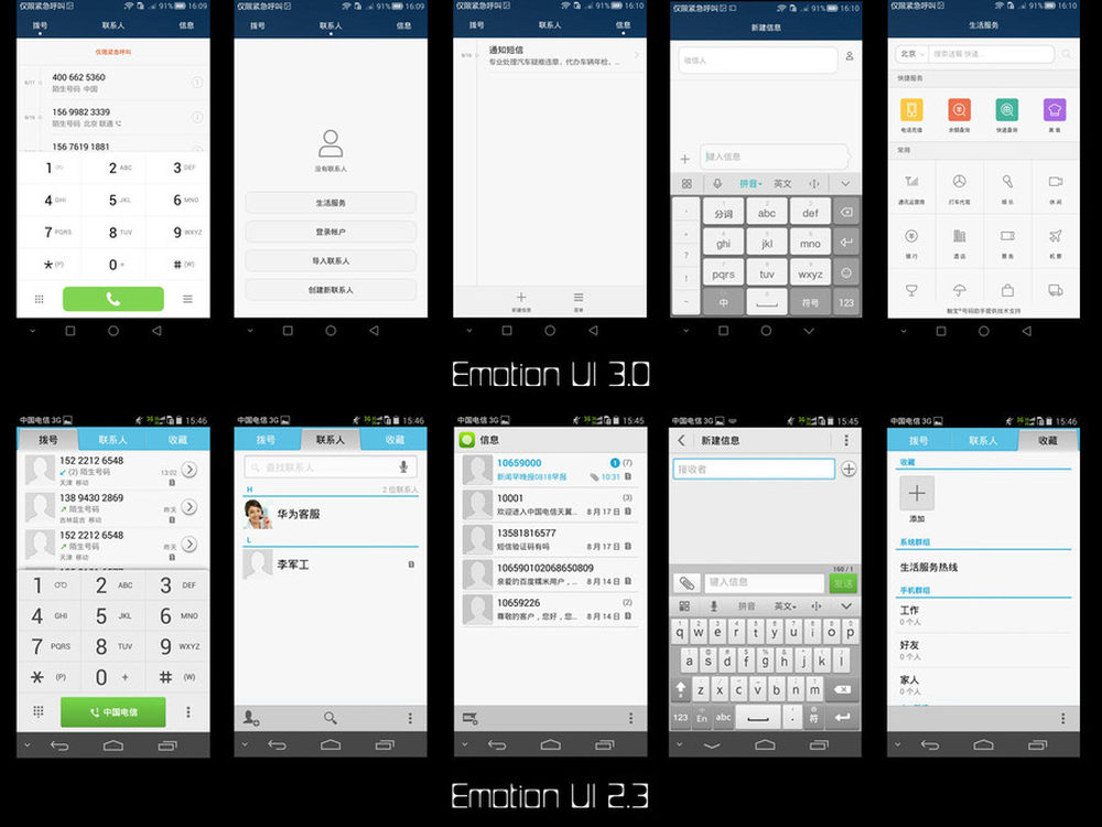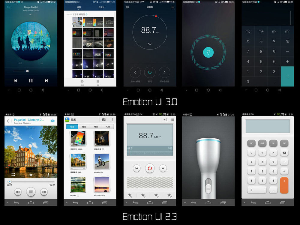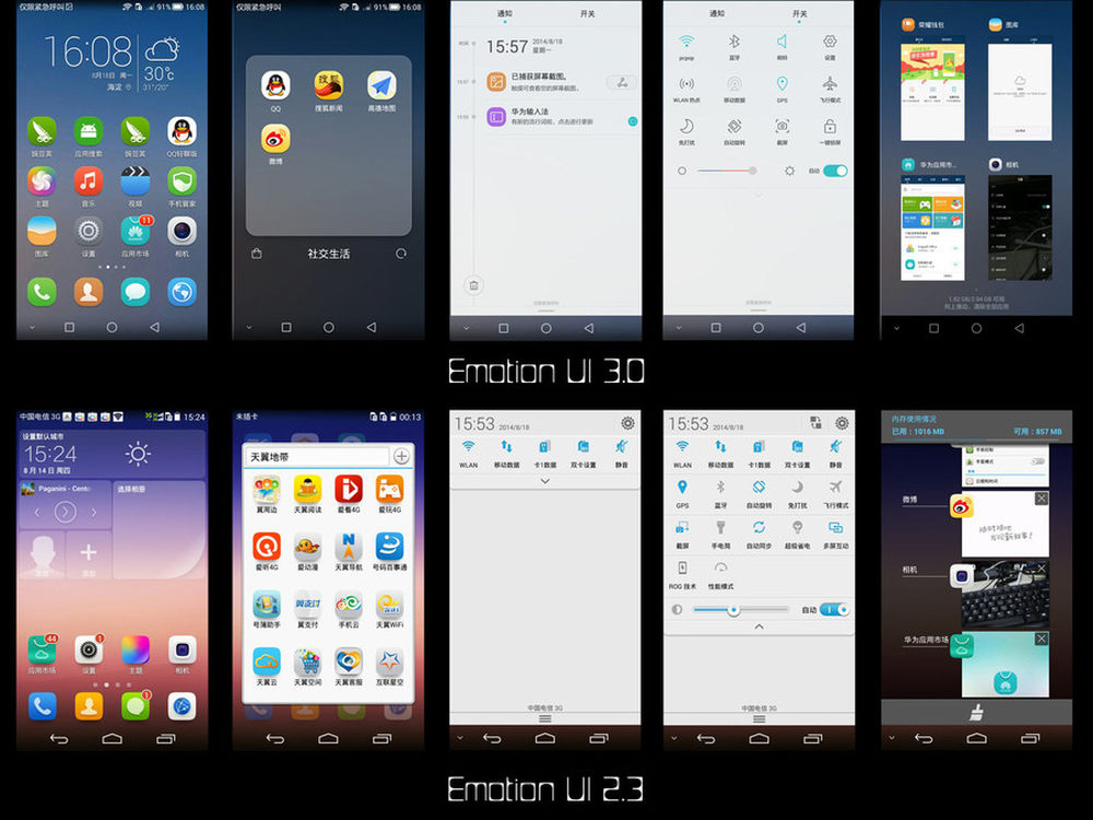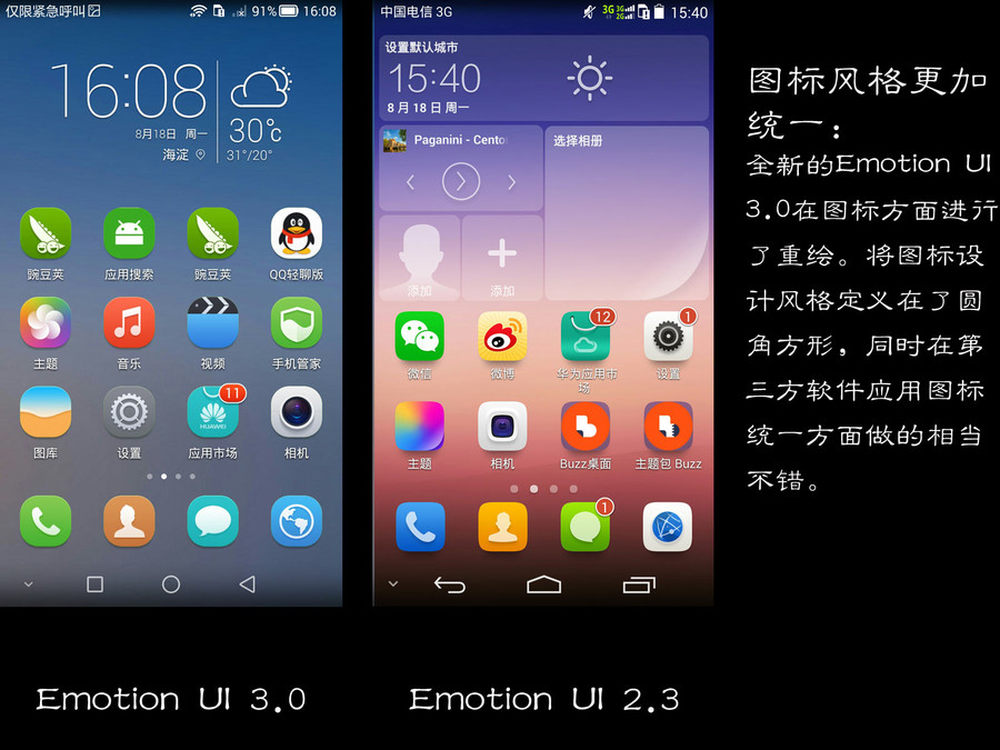 通过对比EMUI 3.0和2.3版本截图不难看出,3.0版本的更新几乎是“推倒式”的更新。不论是从图标的重绘、配色以及设计逻辑方面,已经基本上看不到之前旧华为UI的影子。3/13