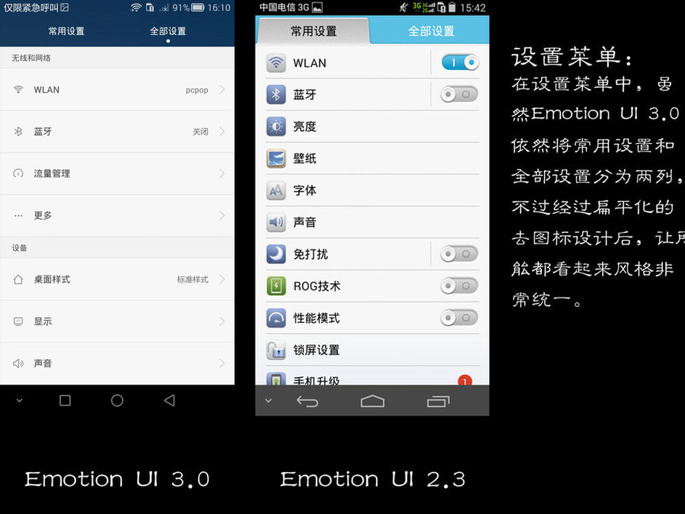 设置菜单:在设置菜单中,虽然EMUI 3.0依将常用设置和全部设置分为两列,不过经过扁平化的去图标设计后,让所有功能都看起来风格非常统一。10/13