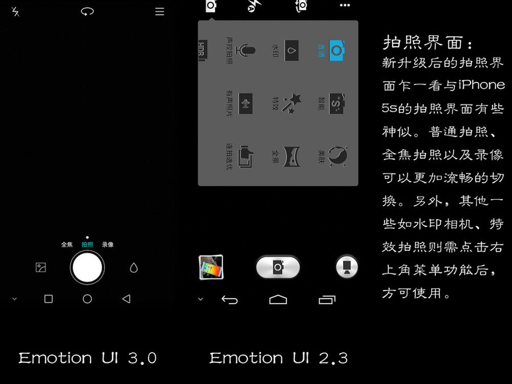 拍照界面:新升级后的拍照界面乍一看与iPhone5s的拍照界面有些神似。普通拍照、全焦拍照以及录像可以更加流畅的切换。另外,其他一些如水印相机、特效拍照则需点击右上角菜单功能后,方可使用。11/13