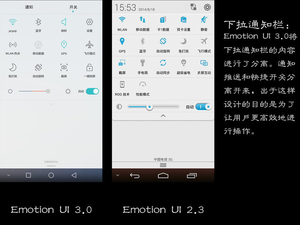 下拉通知栏:EMUI 3.0将下拉通知栏的内容进行了分离。通知推送和快捷开关分离开来,出于这样设计的目的是为了让用户更高效地进行操作。9/13