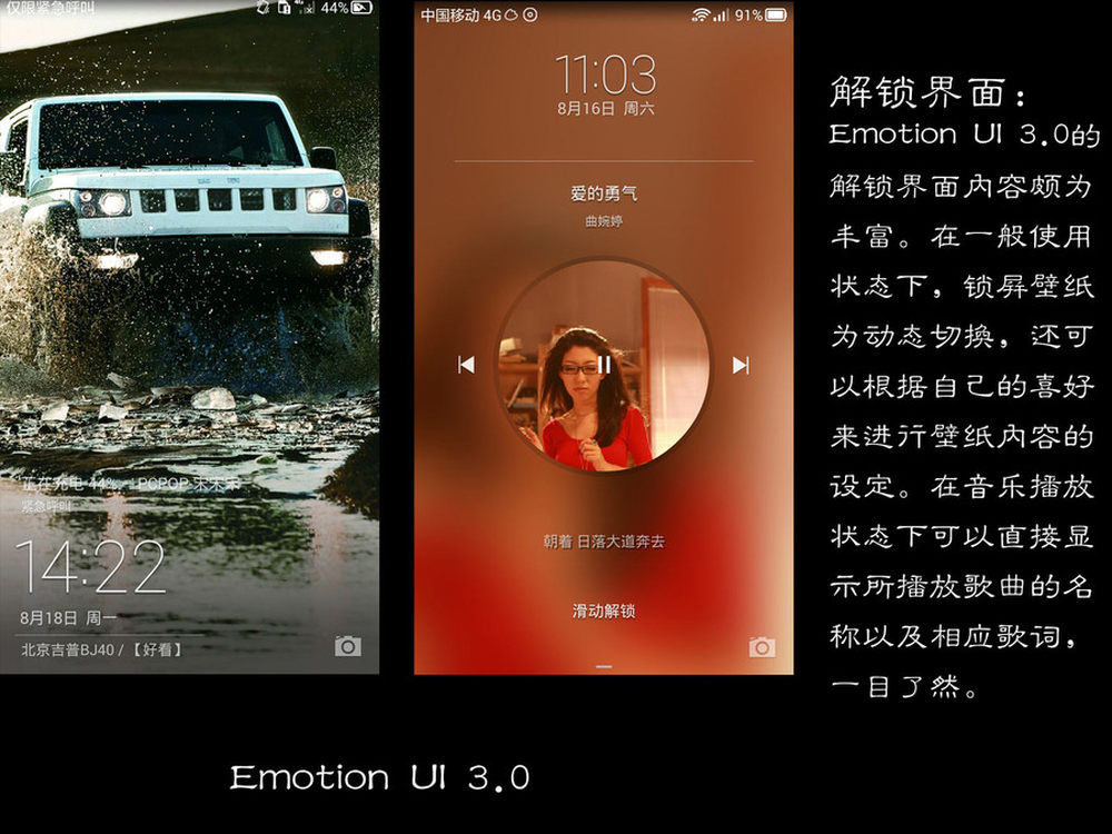解锁界面:Emotion UI 3.0的解锁界面内容颇为丰富。在一般使用状态下,锁屏壁纸为动态切换,还可以根据自己的喜好来进行壁纸内容的设定。在音乐播放状态下可以直接显示所播放歌曲的名称以及相应歌词,一目了然。12/13