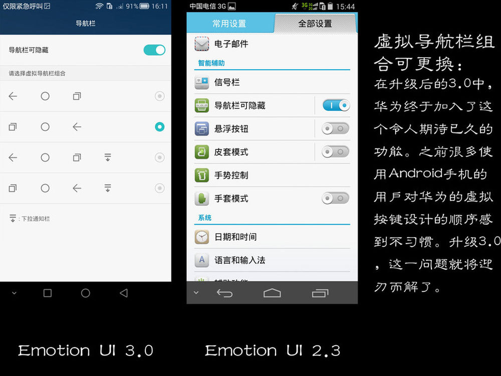 虚拟导航栏组合可更换:在升级后的3.0中,华为终于加入了这个令人期待已久的功能。之前很多使用Android手机的用户对华为的虚拟按键设计的顺序感到不习惯。升级3.0后,这一问题就将迎刃而解了。13/13
