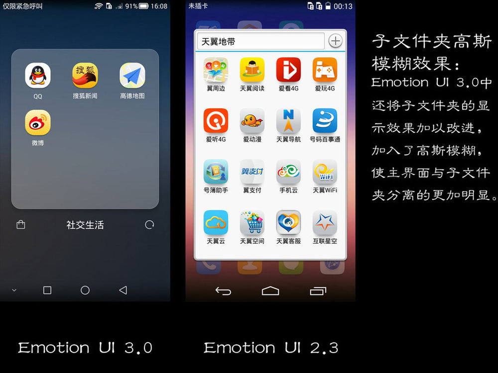 子文件夹高斯模糊效果:EMUI 3.0中还将子文件的显示效果加以改进,加入了效果更加明显的高斯模糊,使主界面与子文件分离的更加明显。8/13