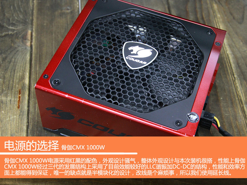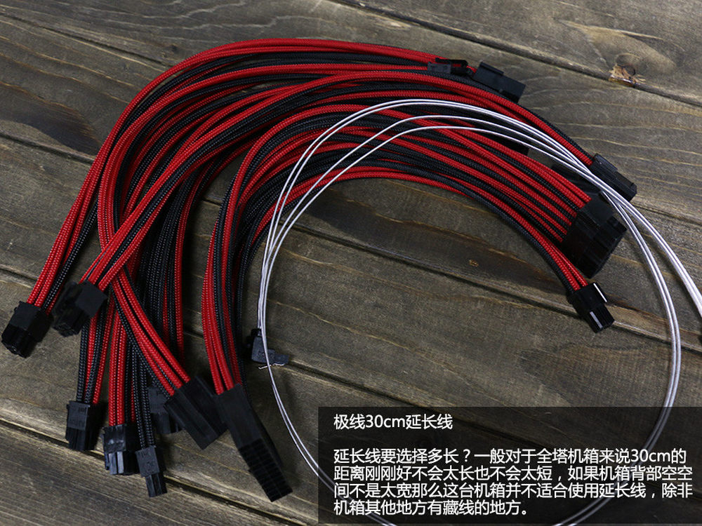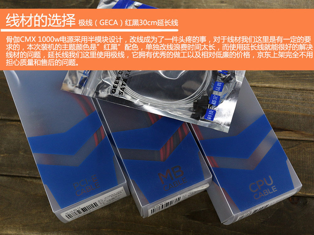 骨伽CMX 1000W电源采用红黑的配色,外观骚气,整体外观设计与本次装机很搭,性能上骨伽CMX 1000W电源经过三代的发展,结构上采用了目前效能较好的LLC谐振加DC-DC的结构,性能和效率方面都能得到保证, 唯一的缺点就是半模块化的设计,改线是个麻烦事,所以这里我们使用延长线进行处理。