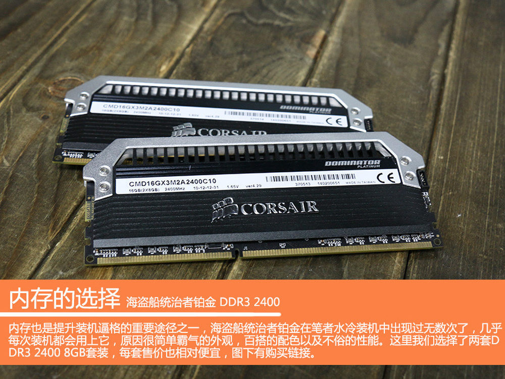 内存也是提升装机逼格的重要途径之一,海盗船统治者铂金同样在笔者水冷装机中出现过无数次了,几乎每次装机都会用上它,原因很简单,霸气的外观、百搭的配色以及不俗的性能。这里我们选择了两套DDR 3 2400 8GB套装,每套售价也相对便宜,文字下面有购买链接。