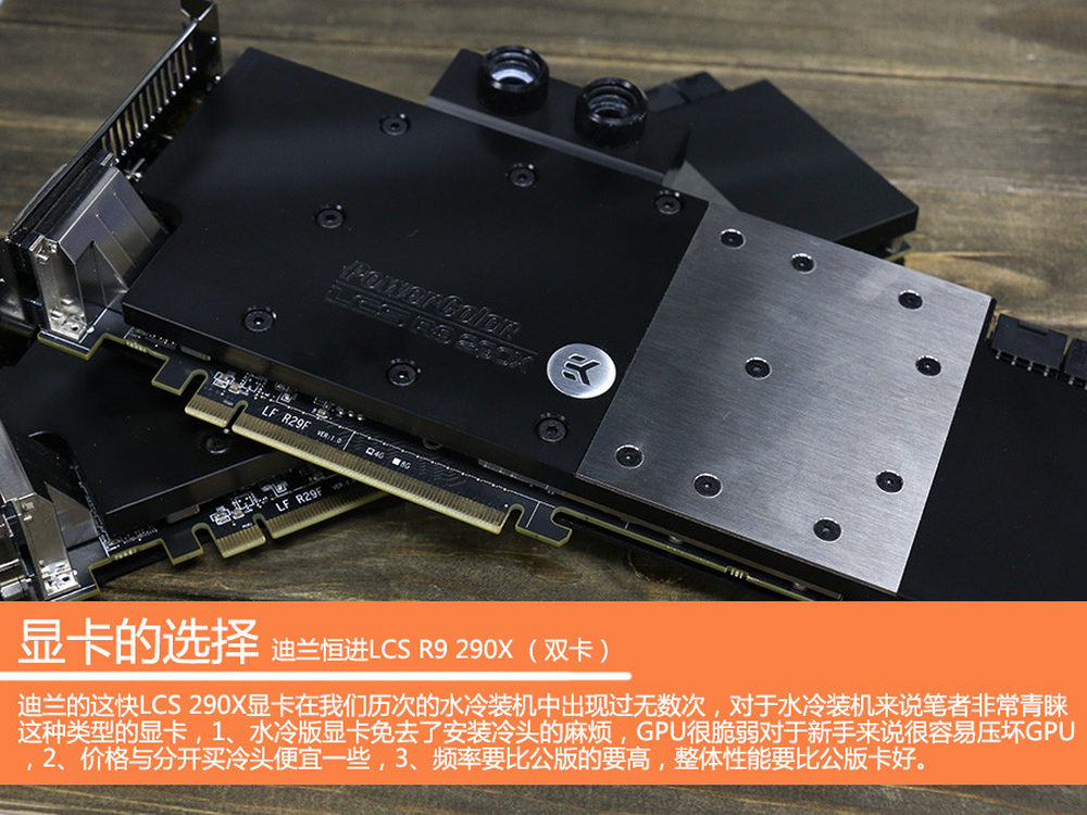 迪兰这块LCS 290X显卡在我们历次水冷装机中出现过无数次,对于水冷装机来说笔者非常青睐这种显卡,1、水冷版显卡免去了安装冷头的麻烦,GPU很脆弱对于新手来说很容易装坏GPU,2、价格方面与分开买冷头要便宜一些,3、频率要比公版的高,整体性能要比公版卡好。