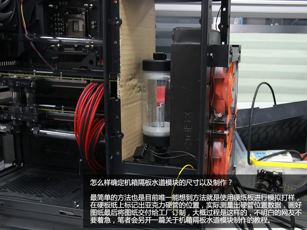 所有水冷部件全部安装完毕,安装之后就要对机箱隔板水道模块尺寸数据进行测量,这里笔者只提个大概,具体制作过程笔者稍候会重新开一篇教程。19/36