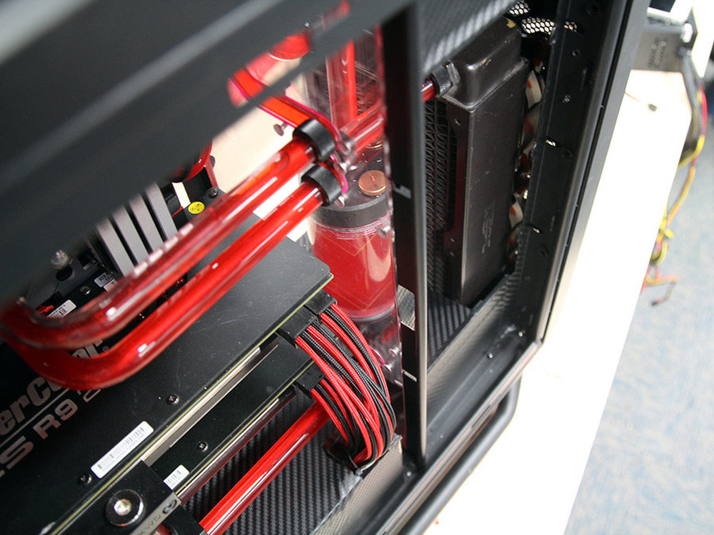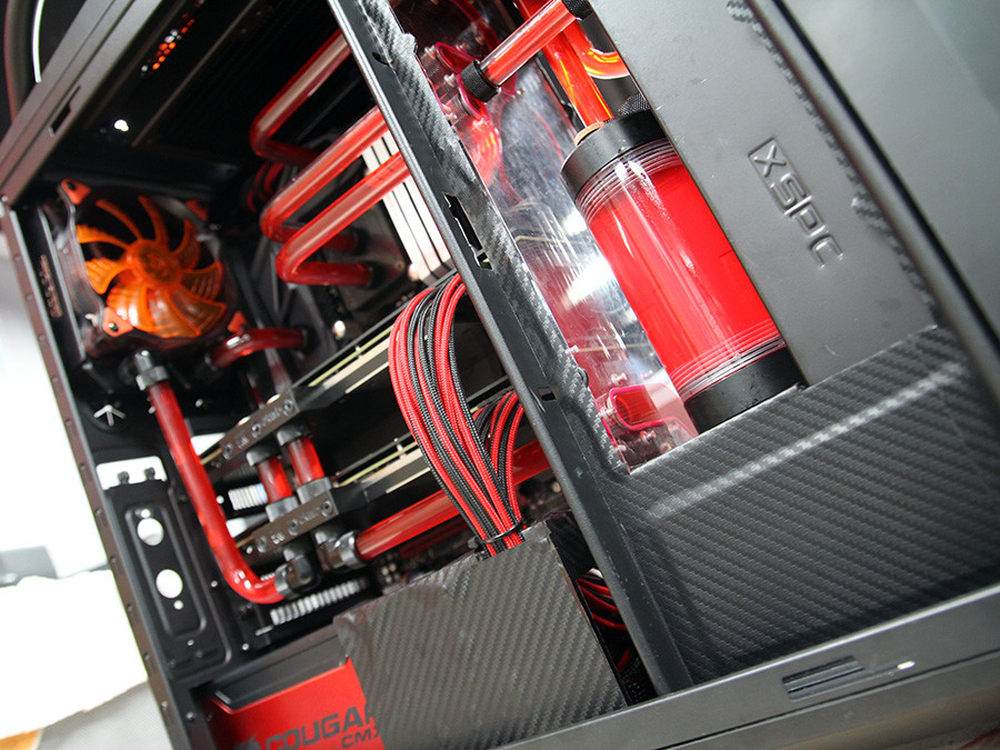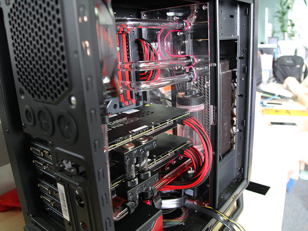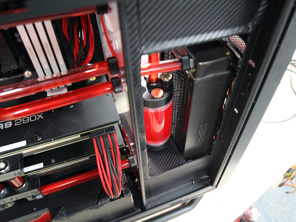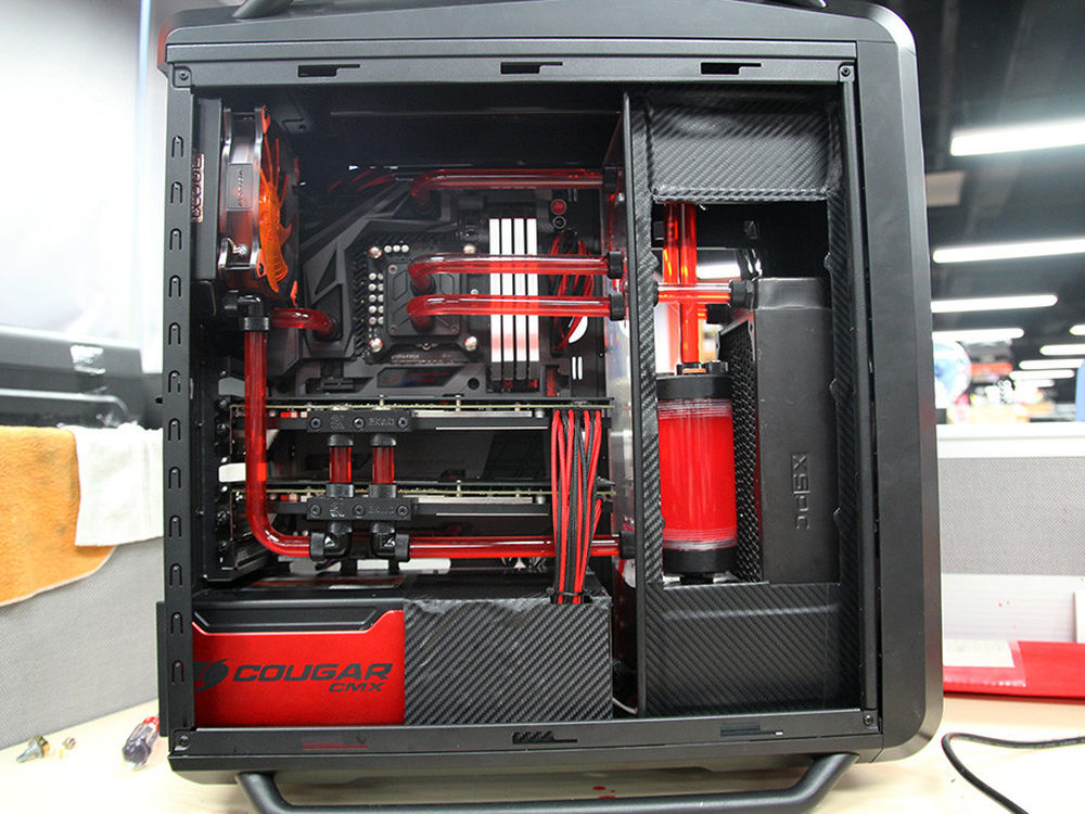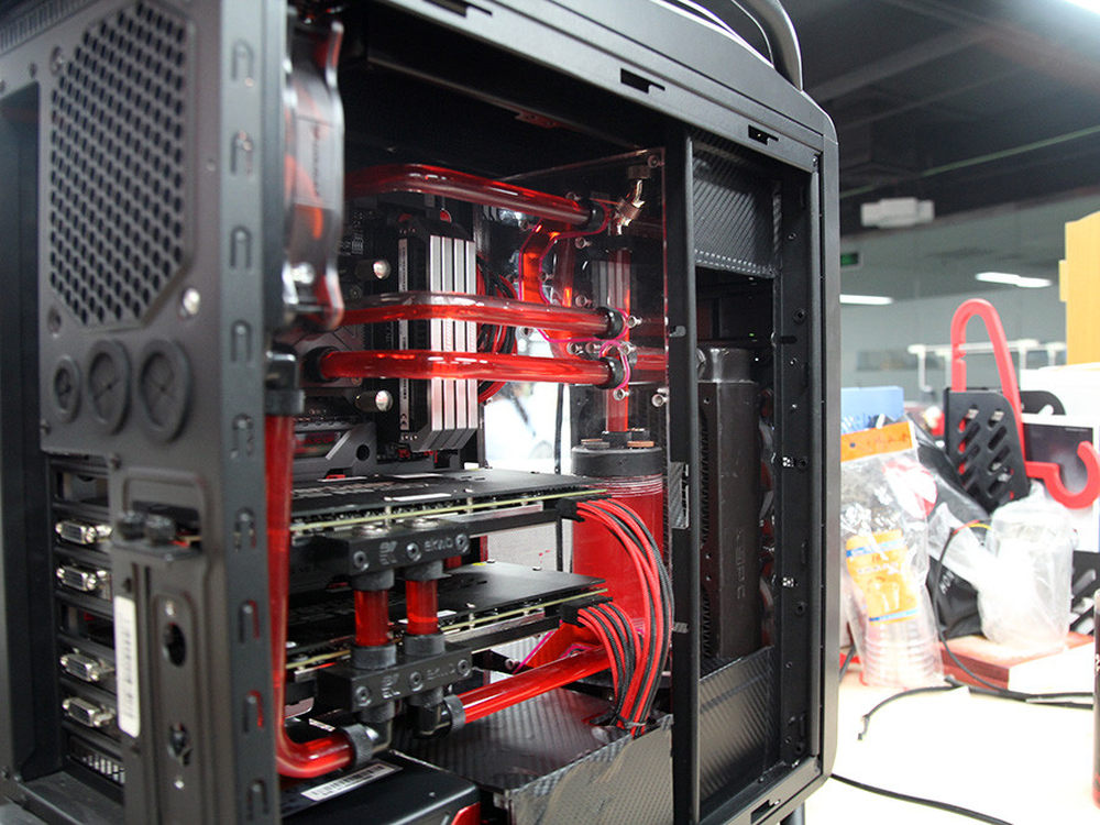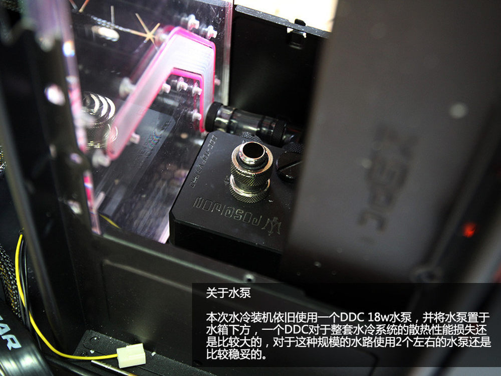 将水道模块、水泵、水箱等一系列水冷配件装入机箱后,再把硬管与模块连接后本次的装机差不多完成了80%%,毕竟最复杂水道模块已经制作完成。剩下的就是加水测试以及理线等细节方面的处理。23/36