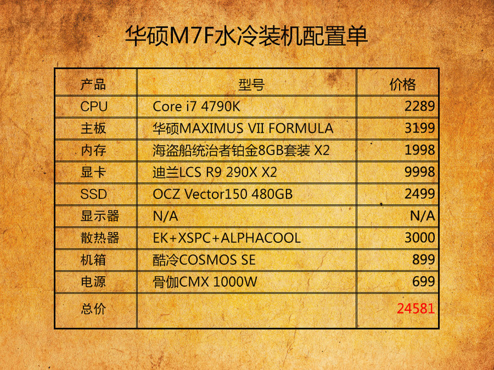以上是本次装机的硬件部分配置表,水冷配件依旧沿用几次水冷装机上留下的配件,本次装机主角是华硕M7F主板,号称最强游戏主板,那么这块主板与水冷能擦出什么样的火花呢?下面我们一一介绍下本次装机的硬件。