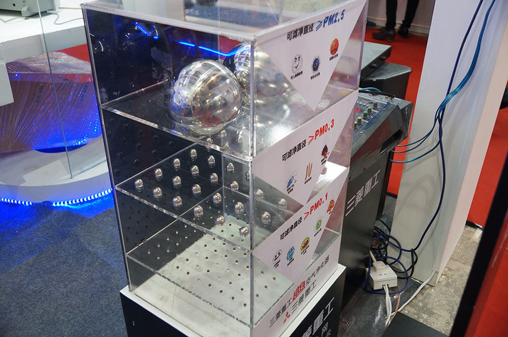 作为强技术品牌,三菱重工在展会期间不仅是展出新品,与净化器有关的知识讲解意在让民众对空气净化更加了解。现场一个展柜中等比放置的金属球为我们介绍了PM2.5、PM0.3以及PM0.1的比例关系。2.5微米的颗粒物已经够小了,而三菱重工的空气净化器能够有效去除0.1微米级颗粒物,空气中的PM0.1对健康危害更大。