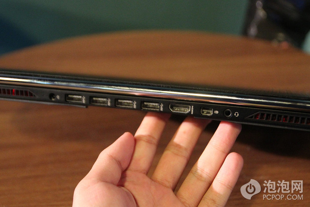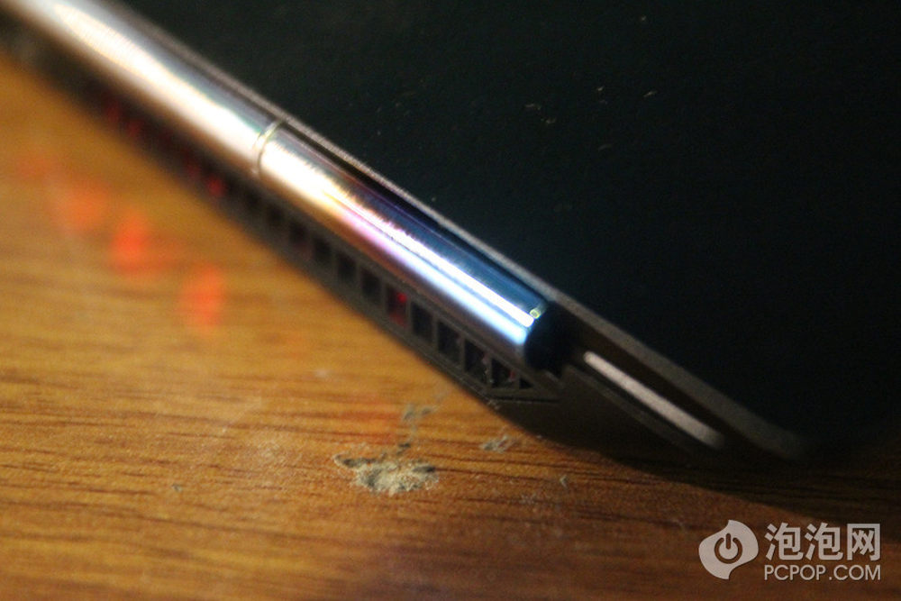 设置在机身侧面的SD读卡器。惠普在ENVY和OMEN两个系列的产品上都采用了夸张的楔形设计,使得本来就很薄的机身厚度看起来薄的更彻底,在ENVY中惠普在楔形边缘还用了一些圆润的角度来进行过度,但是到OMEN这里干脆就用一个锋利的锐角和钝角完成了边缘设计,不知道你是不是喜欢这种设计。12/13