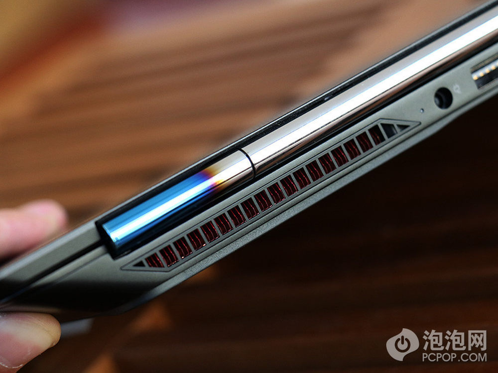 为了更加迎合整机的跑车造型设计,在OMEN转轴的两端还辅以跑车烧色质感设计,让整机更显时尚,同时,在OMEN散热触控口出的散热片同样为红色设计,这样一个不起眼的设计让整机看上去显得更加完美。此外还需说明的是,在开机的时候散热口处同样拥有红色的灯光效果。惠普OMEN炫酷超极游戏本 京东商城 16999元预约中>> 预约地址