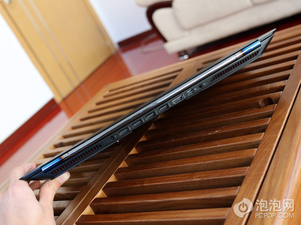 从此图可以看出,在OMEN的机身底部采用了楔形设计,这种设计一直延伸到屏幕,因此这也直接解释了屏幕的面积确实比键盘底座大出一些的原因。惠普OMEN炫酷超极游戏本 京东商城 16999元预约中>> 预约地址