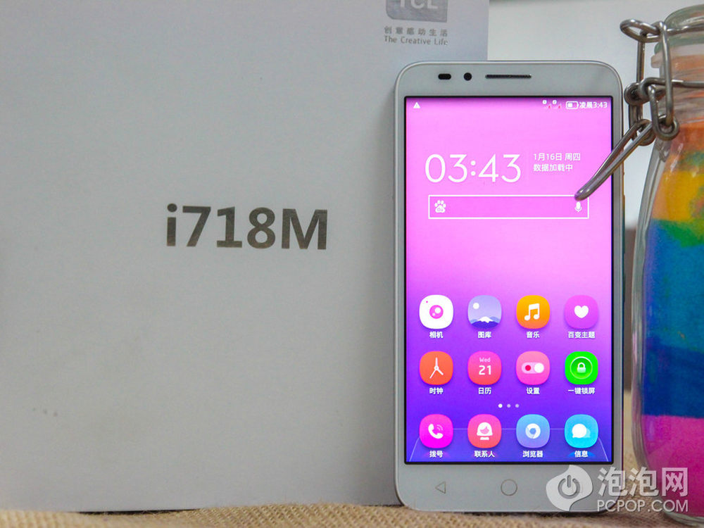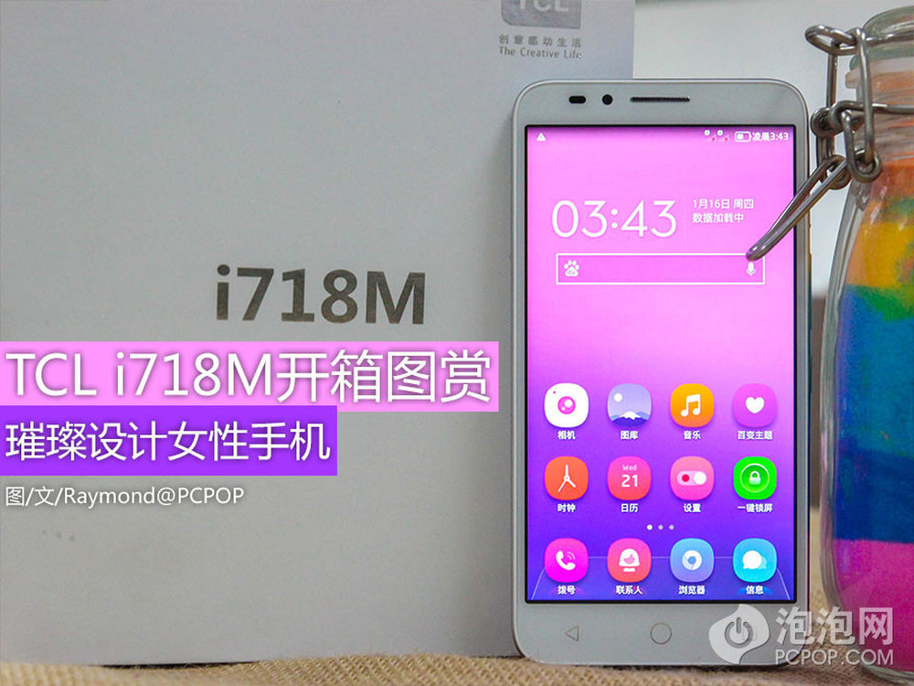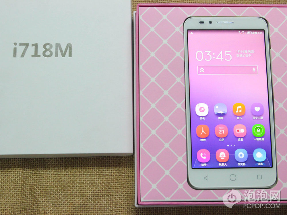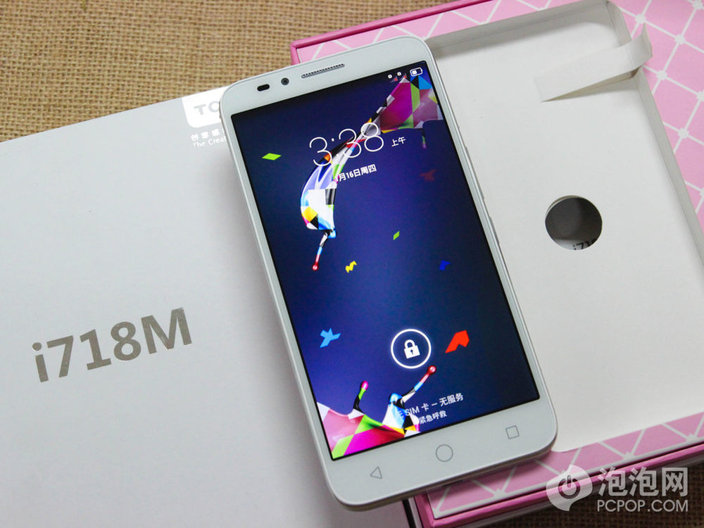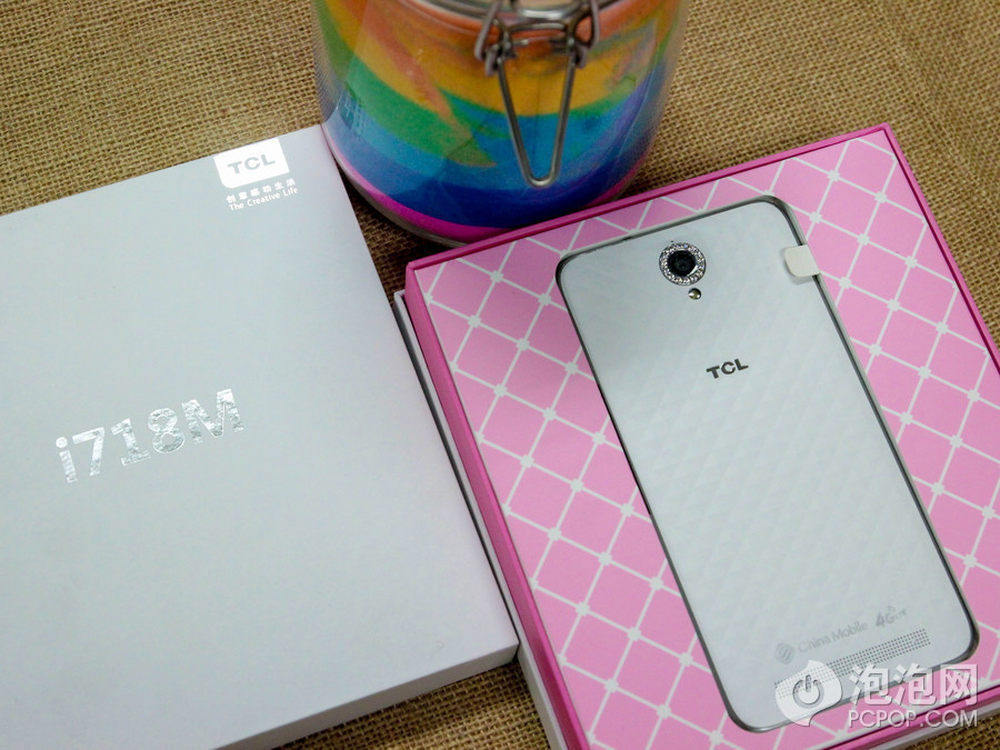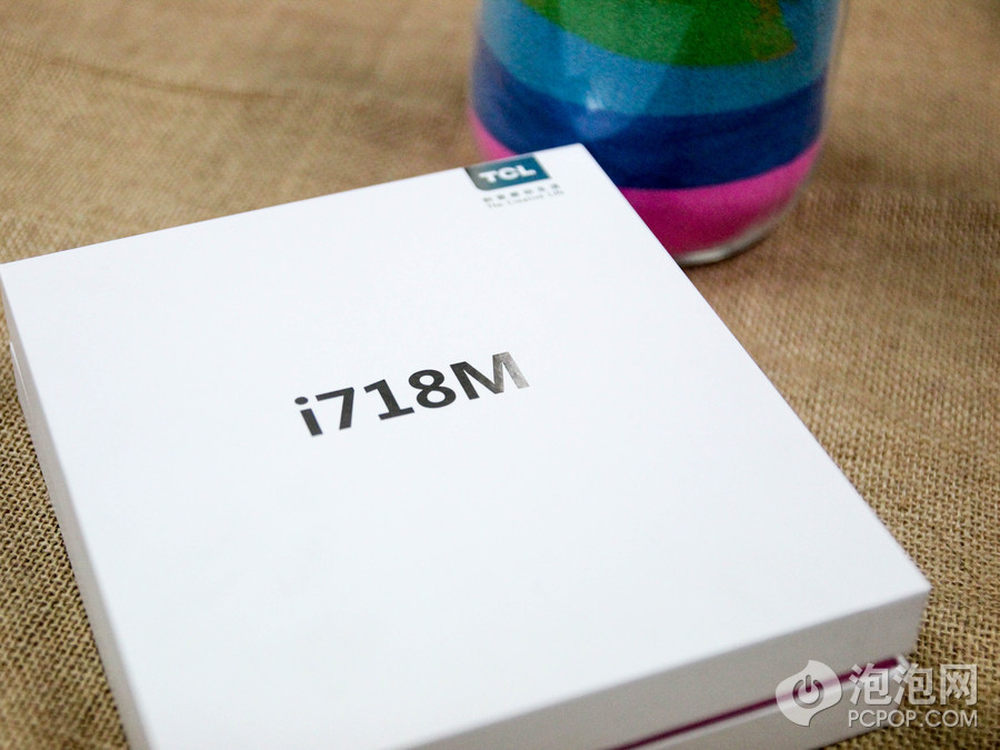 TCL i718M的包装设计比较简单,采用正方形外观,纯白色的表面和粉红色的夹层搭配起来非常具有少女风,正面印有i718M型号标识。3/16