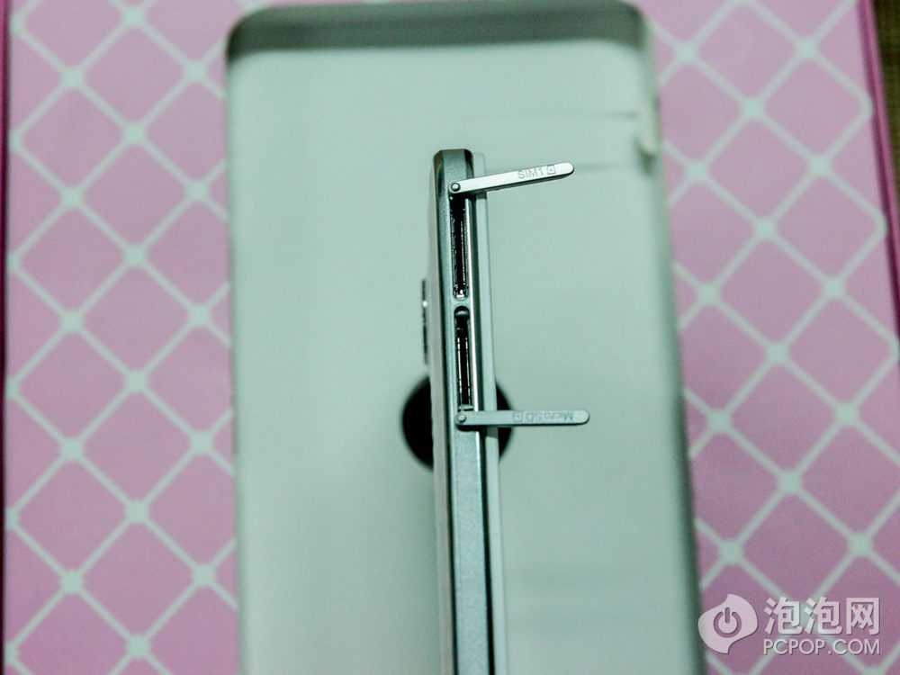 该机是双卡双待机型,但它将两个卡槽分别放置于机身左右两侧,左侧为SIM卡和MicroSD卡插槽。14/16