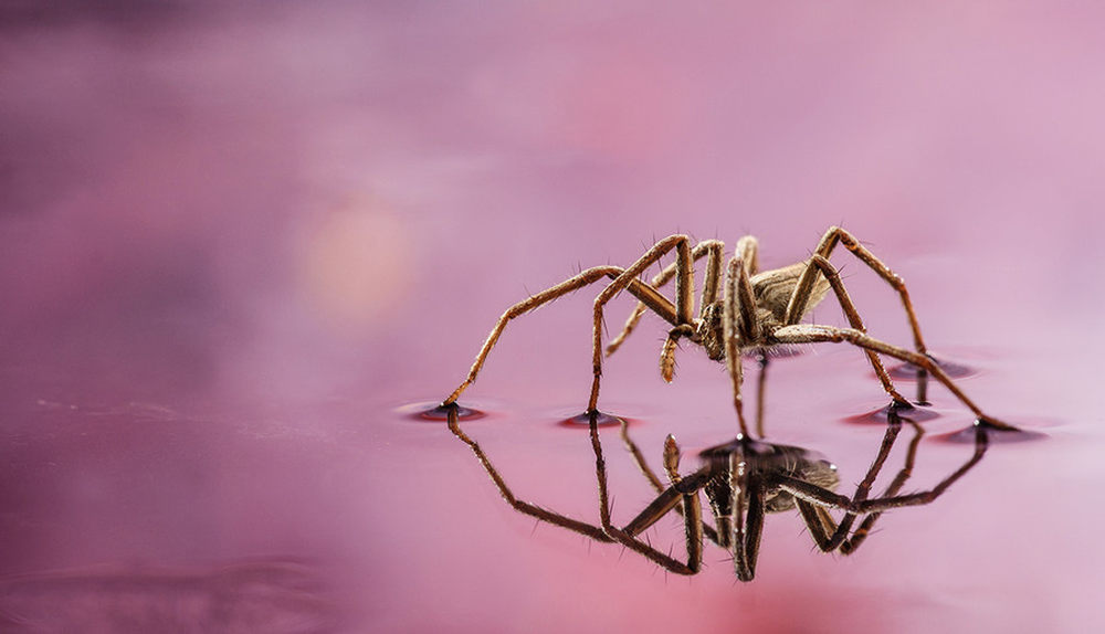 昆虫的拍摄手法非常多样,除了局部的特写,我们还能拍摄昆虫和它的倒影。一只正在水中行走的蜘蛛就被摄影师抓拍了下来。加上自己在水中的倒影和环境映衬的红色水塘,感觉非常有美感。尽管它是一只冷血的蜘蛛。11/12