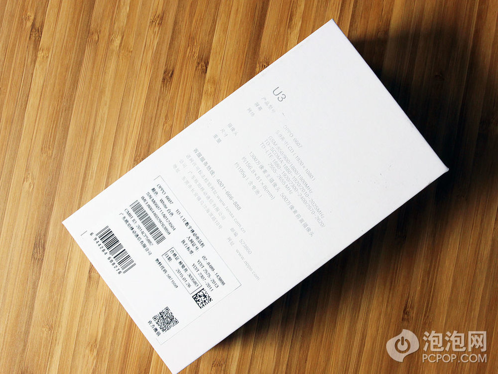 包装盒背部是有关OPPO U3的一些基本参数信息。OPPO U3配备了MT6752真8核处理器,2GB的运行内存、16GB机身存储;屏幕为5.9英寸的1920x1080像素屏幕,373ppi;前置500万像素、后置1300万像素摄像头,最大光圈F/2.0;运行Android 4.4系统而深度定制的Color OS系统界面,支持移动4G网络的双卡双待;3100毫安时不可拆卸式电池。4/23