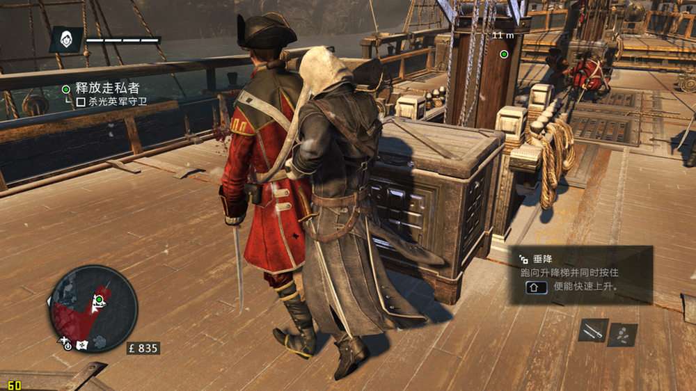 小编技术比较次,才刺杀到第二个守卫就被发现了,结果陷入了和半甲板英军的大混战中。清理完甲板上的守卫后,主角又被从船舱里冲出的英军包围。20/35