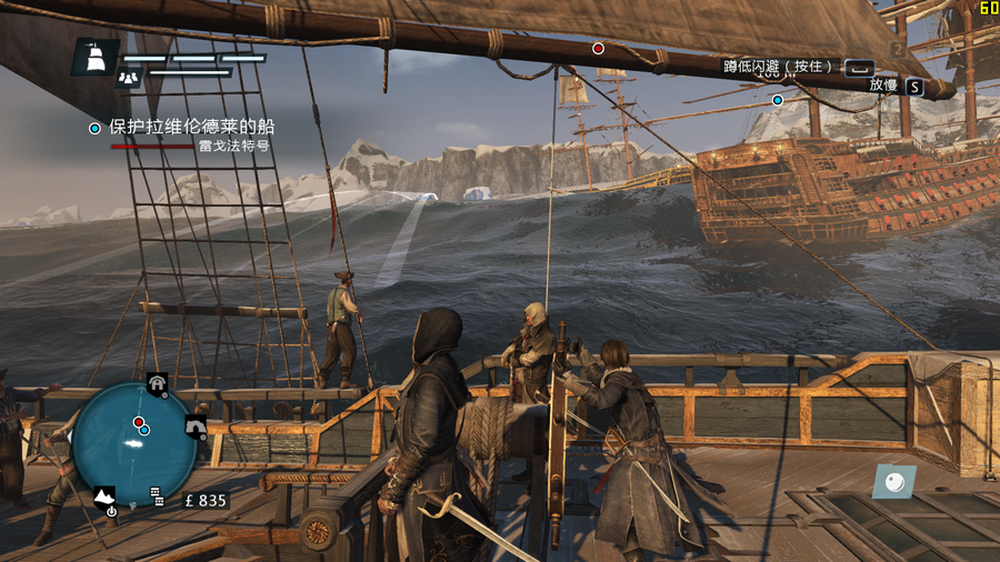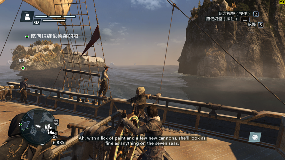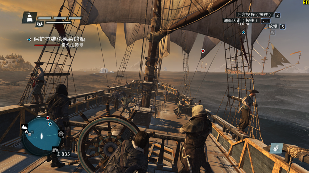 航行了一小段距离后,我们并发现了约瑟夫船长的船和敌人的船,这里按住2可以往后方看,观察后方敌情,当敌人炮火袭来时,按住S可以蹲下身体躲避。23/35