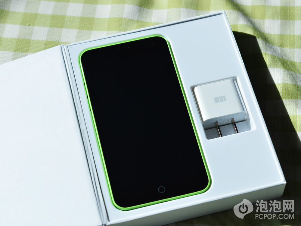 掀开盒盖,真机和充电插头出现在包装盒的第一层,能够看出在屏幕关闭状态下的魅蓝还是非常漂亮的。5/18