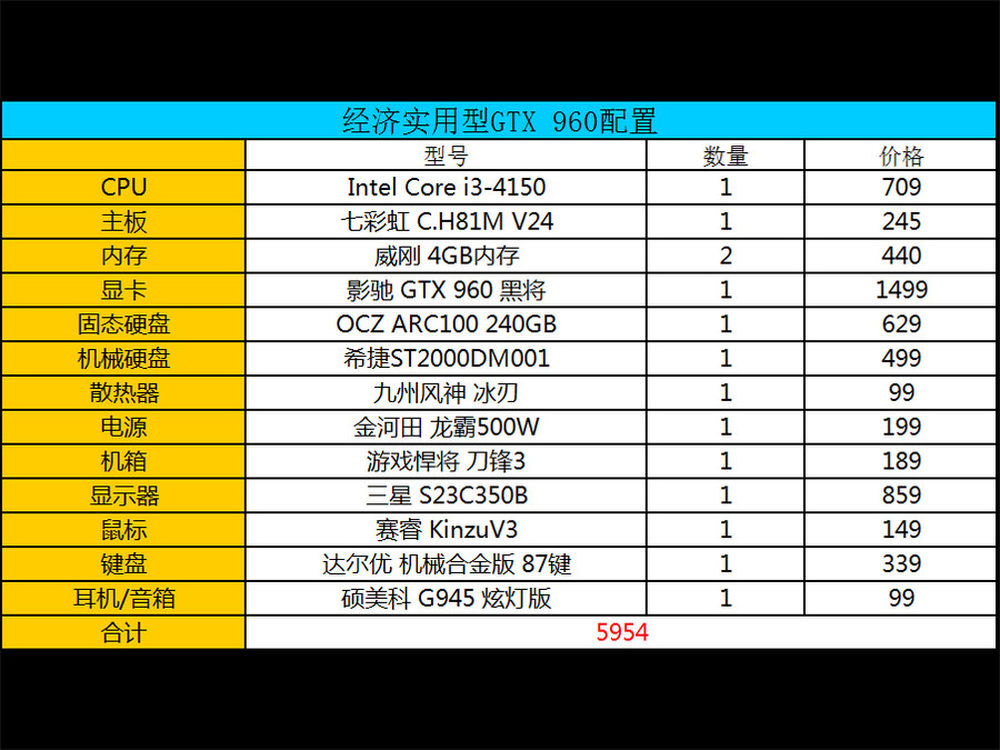 本套经济实用型配置硬件平台基于Intel Core i3-4150与影驰 GTX 960 黑将的组合,总预算达到了6000元左右。i3-4150足够应付一般家庭娱乐对运算性能的需求,GTX960作为新一代甜品级显卡在1920X1080分辨率下面对主流单机游戏大作基本都可以流畅运行。同时4GB双通道内存和饥饿鲨苍穹100固态硬盘的加入,都使整机性能体验更上一层楼。12/12