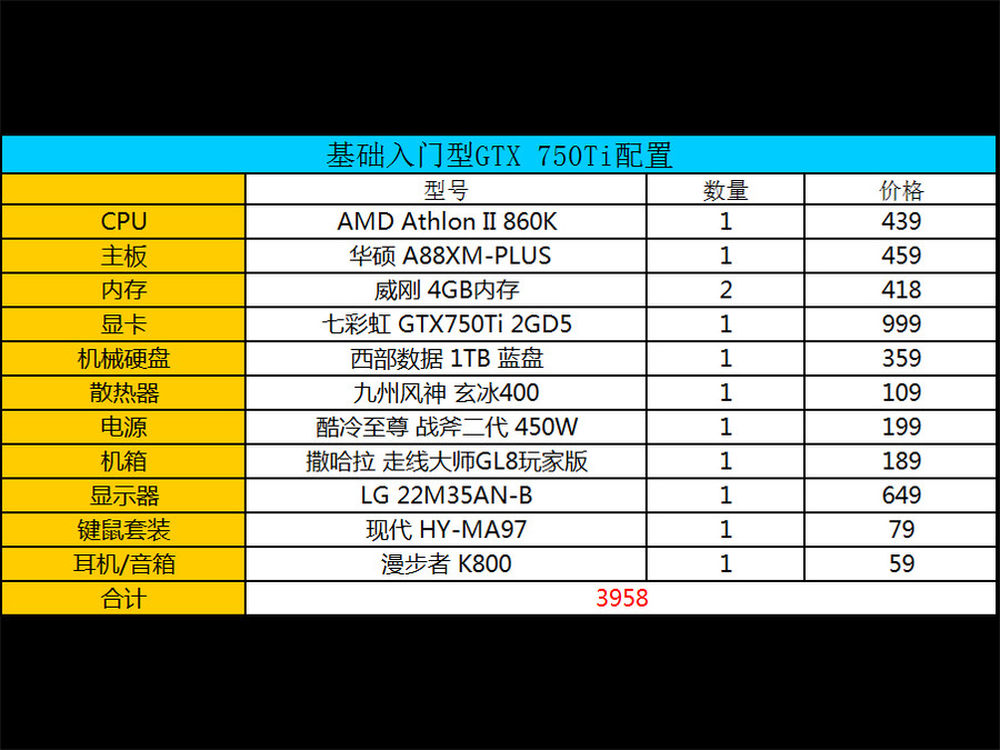 本套基础入门型配置采用了AMD Athlon II 860K与七彩虹 GTX750Ti 2GD5作为核心配置,力图在预算极其有限的情况下达到最高的性价比。速龙860K作为入门级四核心CPU性能不错,基本上是500元档入门的最佳选择。GTX 750Ti