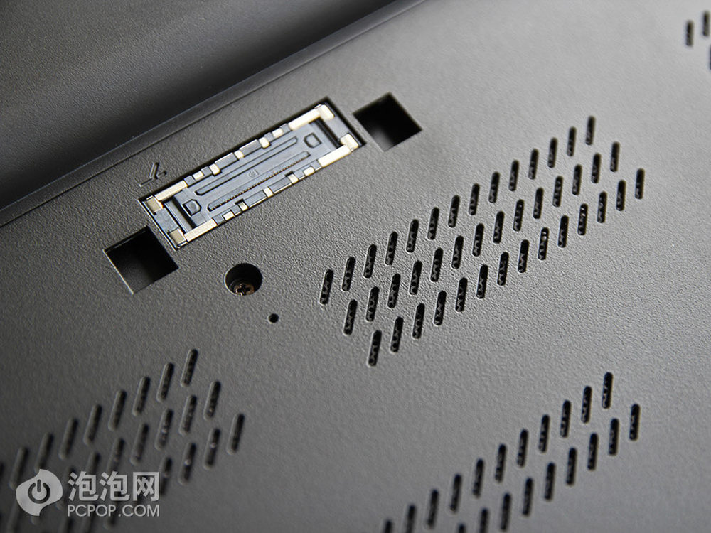 机身底部,拥有大面积的散热进风孔,通过散热孔可以清晰的看到机身内部的金属支架,细节设计非常到位。