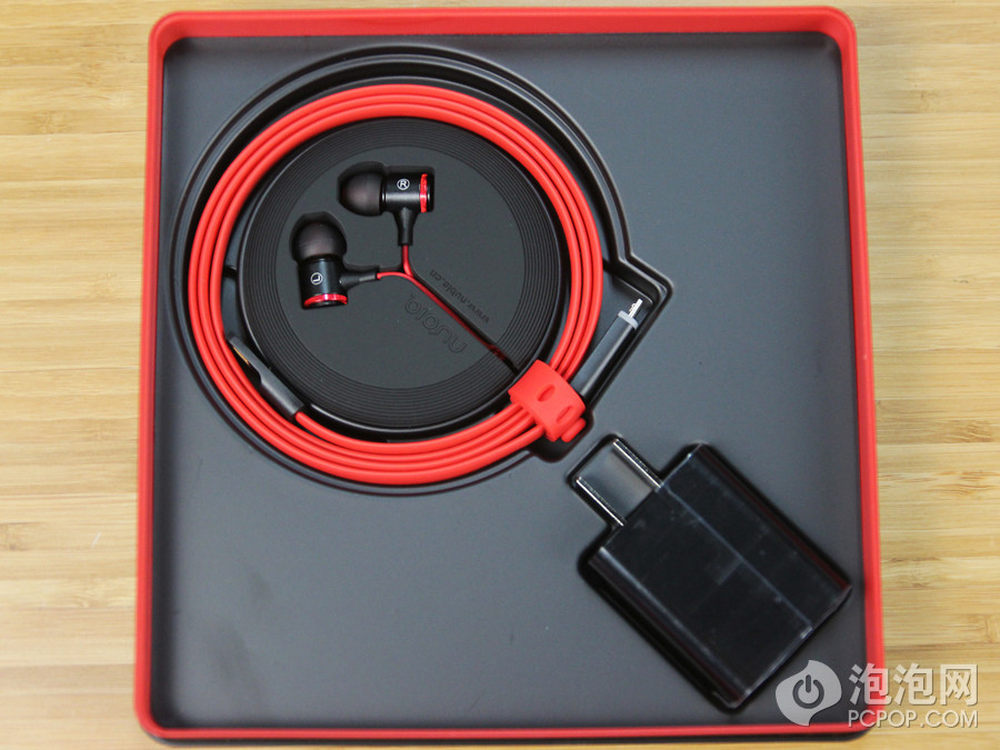 将手机拿掉,就可以看到手机的配件。nubia Z9采用了红色的配件,颜色很醒目。手机的数据线以及耳机线都是红色的。