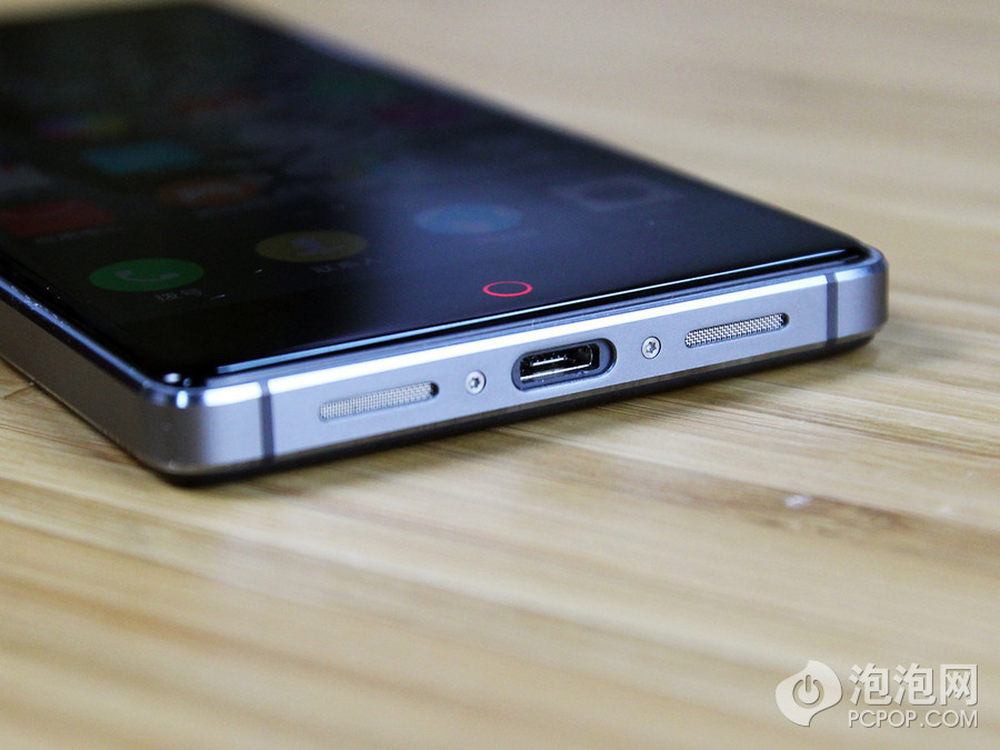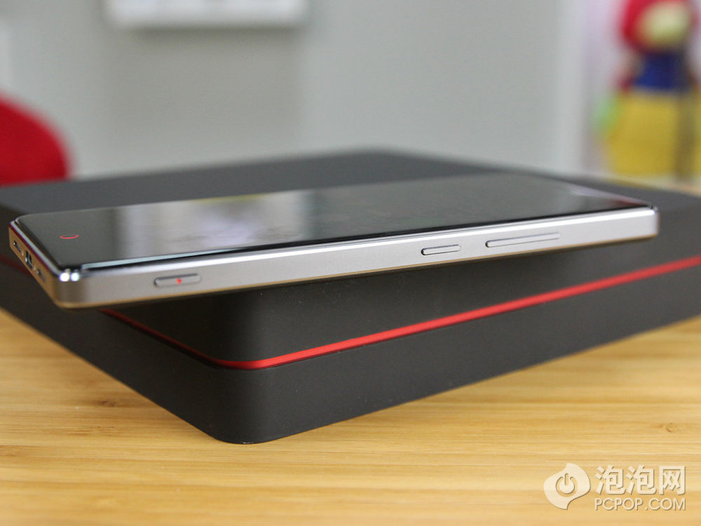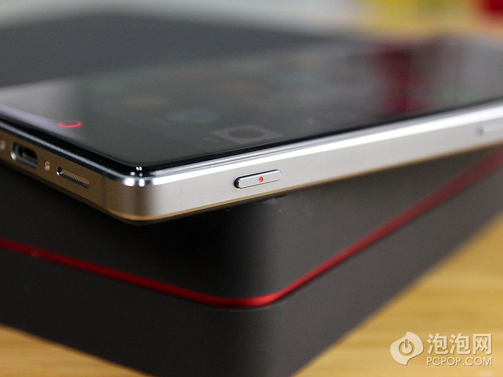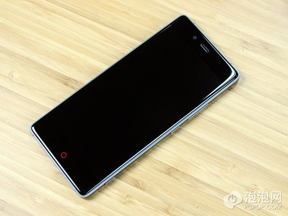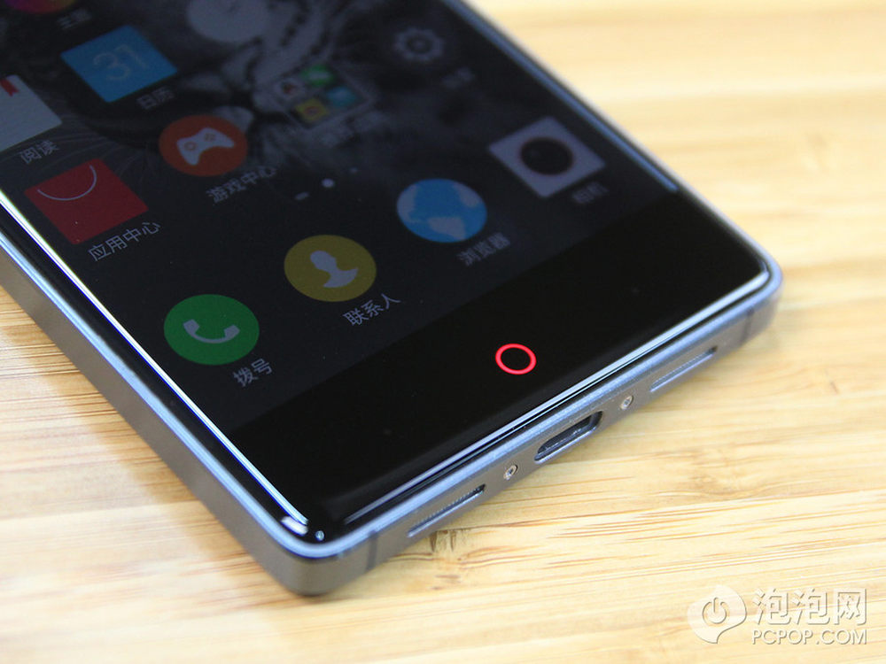 底部是nubia标志性的红色Home键,左右两边还有两个功能键隐藏起来,当使用的时候会亮起红色的背光灯,看起来就是两个小红点。