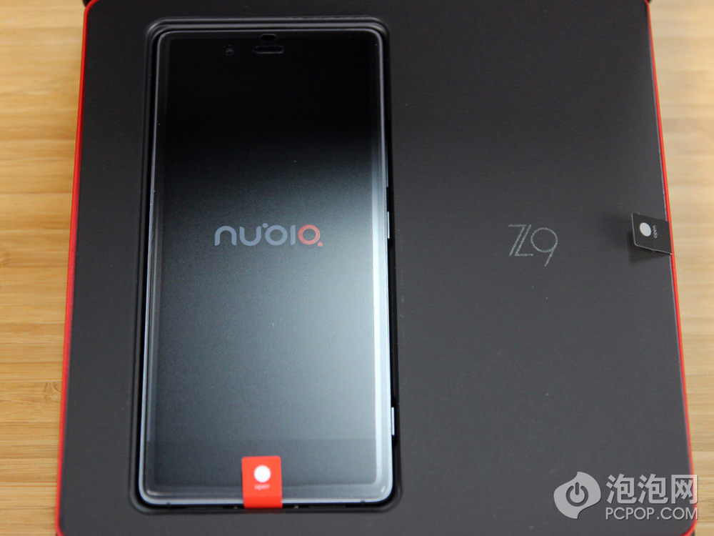 打开手机包装,就可以看到nubia Z9的真机了,新机在屏幕上贴有保护膜,底部的红色标签非常醒目。