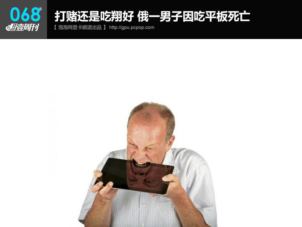 话说果真是世界之大无奇不有,上周,俄罗斯圣彼得堡警方便遇到了这样的一个离奇案件,据消息称,当地一名男子不知什么时候开始不断的像向窗外仍东西,正当警方赶到现场想要阻止他的时候,他已经开始在吃平板了,没错就是吃平板!据当地警方称们这是一名41岁的失业男子,虽然警方在此过程中进行了阻止,不过该男子还是因为吃掉了大量的玻璃和平板的其它部分而导致死亡,至于他吃掉的到底是何品牌平板,现在还不得而知!