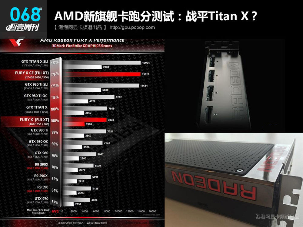随着6月16号正式发布的临近,AMD Fiji核心旗舰显卡开始频繁的曝光,继首次性能跑分现身GFX/Compubench数据库后,VideoCardz又新鲜出炉了喜闻乐见的3D Mark基准测试。从测试图中可以看到,在FireStrike Performance和Ulra(4K分辨率)中,默频下的三强“Titan X、Fury X、GTX 980Ti”成绩非常接近,Fury X微微领先980Ti,但相较R9 290X,提升了接近55%%。现在的关键就是价格了,目前国行980Ti定价4699元,Titan X是7999元,Fury X到底会卖多少呢?