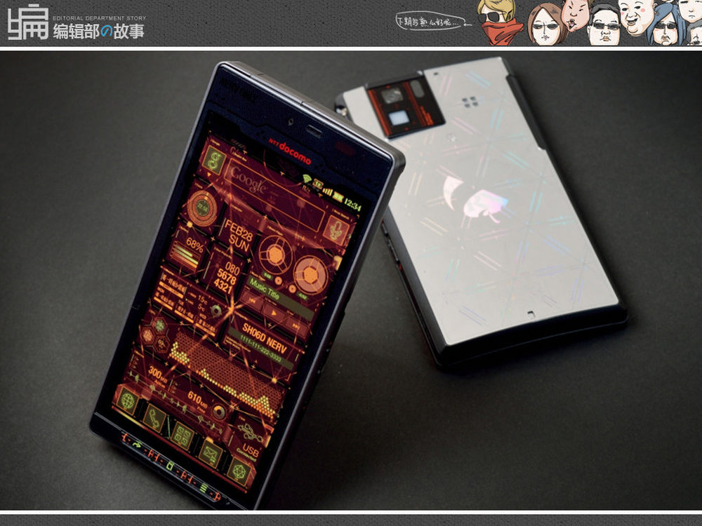 小博同学的第一个答案也是夏普Aquos Crystal X 402SH,不过在听到我说大国也提了这台机器后马上说“那我换一个。”至于原因嘛,大家不要瞎猜......小博选了这台型号为SH06D的夏普EVA定制机,手机背面的渐变色条设计很引人注目,但是这个桌面是不是略乱.....
