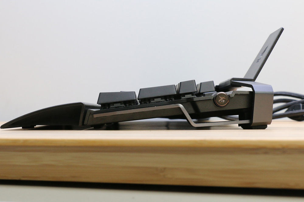 在侧面视角下可以看到GK2000采用的是时下流行的悬浮设计,并采用了梯度键帽来实现人体工程学设计,立体的钛合金支架为键盘提供了稳定的支撑。5/17