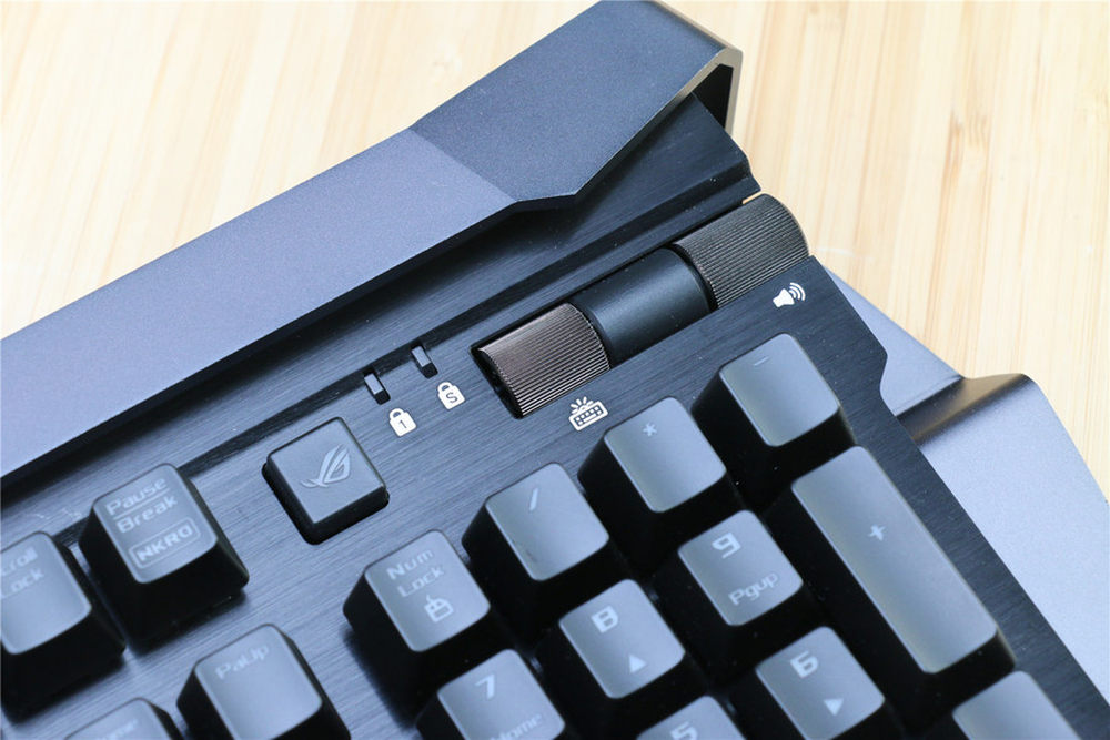 右上角的功能控制区域集中了Win键锁定键、键盘指示灯、键盘背光亮度调节旋钮和音量控制旋钮。其中Win键锁定与大小写锁定键指示灯集成到了一起,开启大写锁定ROG的“败家之眼”红灯亮起后视觉效果非常赞。键盘背光亮度调节旋钮为金属材质,旋转阻尼适中刻度并不十分明显。音量控制旋钮阻尼较大刻度明显,同时还可以向内侧按动达到迅速静音的效果。7/17