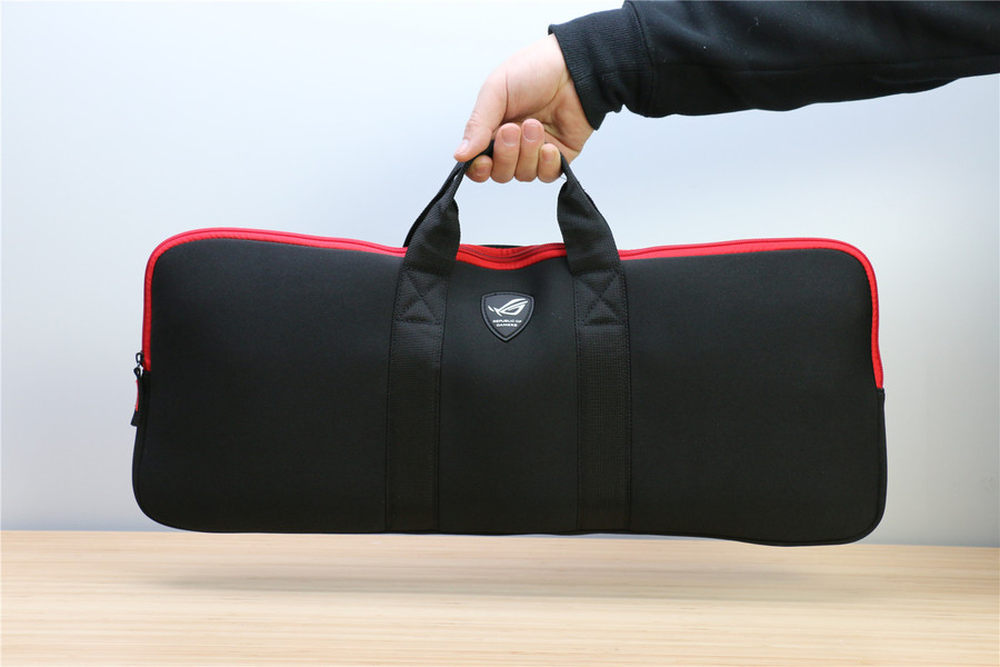 最后GK2000还拥有一个专用的键盘收纳包,ROG黑红配色布面材质,内部植绒,可以完美不失逼格的携带GK2000出行,实乃居家旅行、电竞比赛的必备之物。17/17