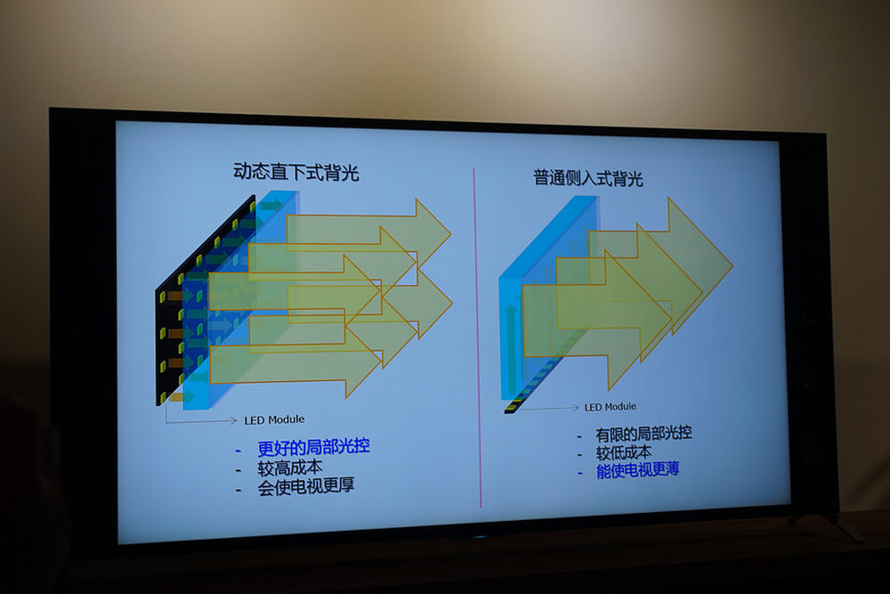 以往我们接触的电视多采用侧入式背光,机身某个侧边拥有一条LED背光,它的光线通过导光板扩展到整个电视面板,而后经由液晶的偏转控制将光线释放到我们眼中。此外,还有一种更为细化设计的直下式背光设计,液晶面板后方是矩阵式的大量LED背光元件,因而这种设计可以更加细致的控制某些区域的背光输出。这种背光结构可以轻松达到数百个背光分区,然而最大的问题是成本难以把控,如果做到HDR所需的1000尼特亮度,搭载直下式背光的电视绝不会在售价上妥协。6/13
