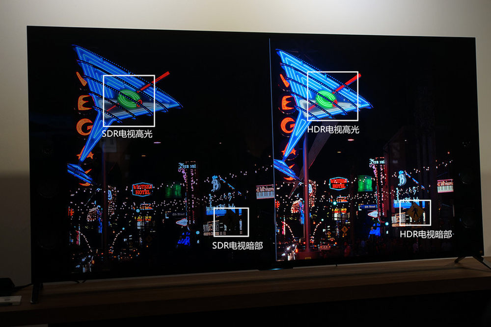 这张图是普通电视播放普通片源以及HDR电视播放HDR片源的演示效果展示,能够明显看到右侧HDR电视的高光更亮,同时暗部的细节比普通电视也更加丰富。而左侧的普通电视则是为了控制暗场而拉低整体亮度输出,因此灯箱广告以及路面灯光被整体调暗,同时仔细观看你会发现颜色也有些“发灰”,不够通透饱和。8/13